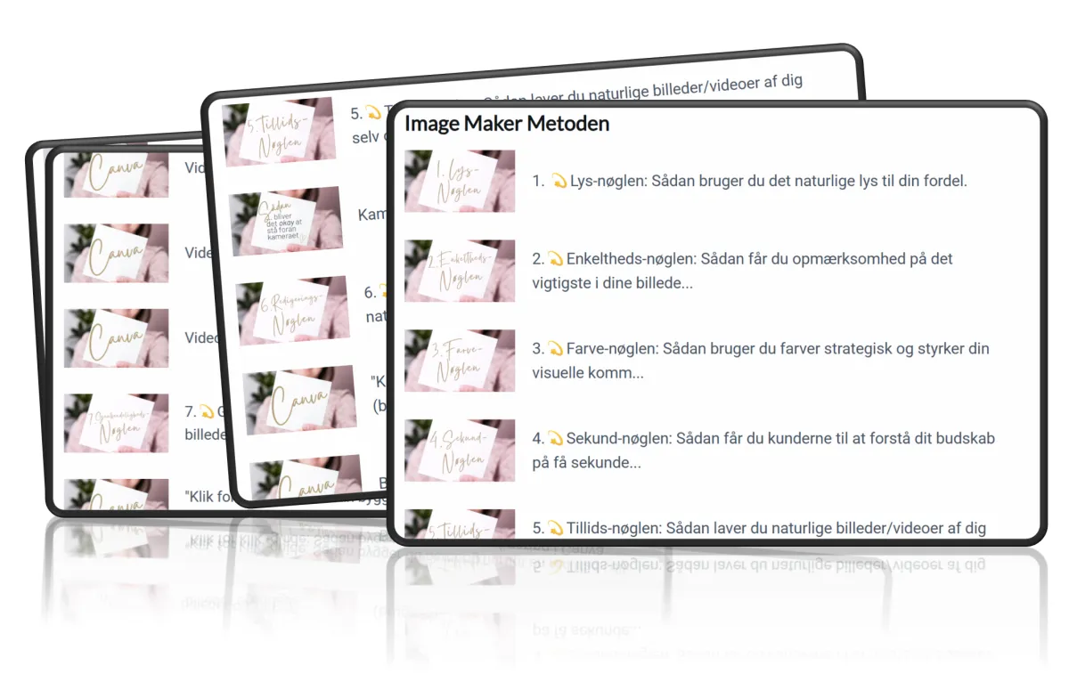 Image Maker Metoden, med de 7 image-nøgler til billeder og videoer, der føles rigtige, viser din faglighed og skaber resultater i din forretning. Du guides trin-for-trin gennem korte videoer, praktiske tjeklister og konkrete eksempler, så du hurtigt og nemt kan bruge metoden.